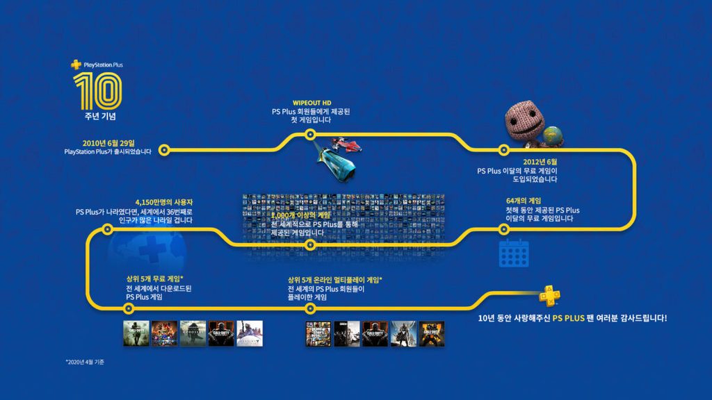 최초 제공된 PS Plus 무료 게임 WipeOutHD부터, 지난 10년 동안 PS Plus 회원들에게 제공된 1000개가 넘는 게임들까지, 지난 몇 년간 PS Plus의 성장을 확인하는 건 정말 멋진 일입니다. 추억을 되짚으며, 지난 10년간의 PS Plus 간단한 인포그래픽을 보여드리고자 합니다. 다시 한 번 여러분께 감사드리며, 앞으로도 많은 관심과 사랑 부탁드립니다!