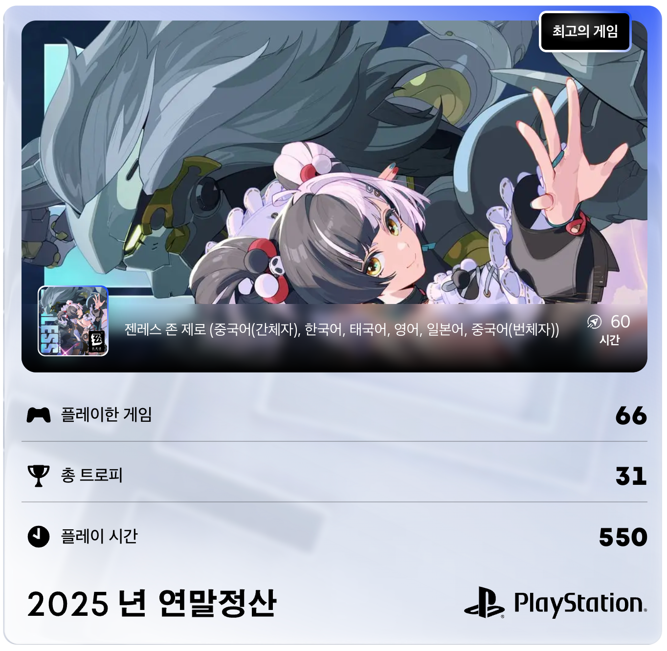 2026년 1월 8일까지 PS5 및 PS4 플레이어는 PlayStation 2025 연말정산*을 통해 가장 많이 플레이한 게임과 장르, 싱글플레이어와 멀티플레이어 타이틀 전반에서 총 플레이 시간, 맞춤형 PlayStation Plus 플레이리스트, 트로피 마일스톤 등을 포함해 한 해 자신의 게임 성취도를 확인할 수 있습니다. 또한 VR2와 같은 PlayStation 액세서리, PlayStation Portal 리모트 플레이어, 가장 많이 사용된 DualSense 무선 컨트롤러 디자인 등으로 게임 플레이에 대한 인사이트도 확인해 보세요.
